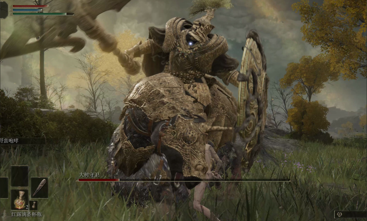 始终保持位于其持戟手相反侧,利用盾牌格挡普通劈砍,对冲锋下劈则需提前向武器外侧位移。每次格挡或翻滚后最多反击两次,重点把握两招盾击后的长时间硬直进行蓄力攻击。二阶段新增的盾牌砸地需向后连续翻滚两次躲避,该招式结束后可安全跳劈。击败大树守卫后获得黄金戟与3200卢恩,该武器具有优秀的力量加成与特殊战技。若多次尝试仍难以战胜,建议暂时放弃并继续探索宁姆格福地区,通过击败其他敌人获取强化素材提升武器等级。