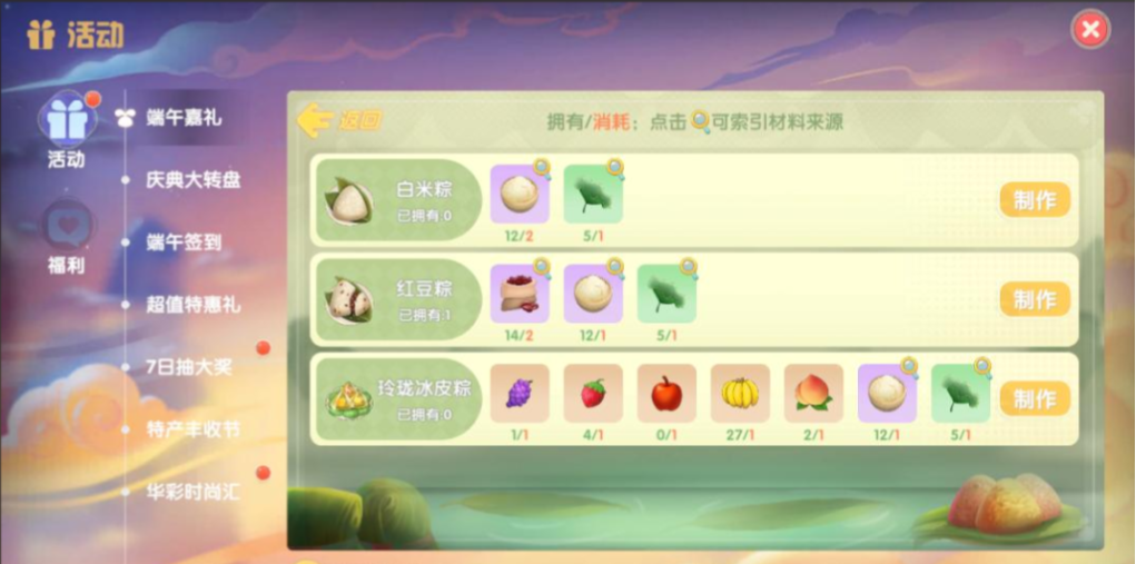 水晶粽的制作材料非常简单,只需要苹果、草莓、香蕉、桃子和葡萄各1个。这道菜在餐厅售卖时消耗时间极短,70秒就能完成一份,是目前最赚钱的菜谱之一。如果小摩尔们想快速积累摩尔豆,可以多囤一些水果材料,批量制作水晶粽。端午活动有时间限制,错过兑换期就无法获取蛋黄肉粽菜谱了。