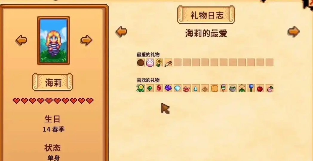海莉是一位性格开朗的金发少女,住在小镇南部与姐姐艾米丽同住。想要提升她的好感度,关键在于了解她的喜好和触发爱心事件的技巧。她最爱的礼物包括椰子、向日葵、水果沙拉和粉红蛋糕,喜欢的礼物则有各类宝石、咖啡和花卉。每周可以送两次礼物,生日当天送最爱礼物能大幅提升好感度。记得避开她讨厌的鱼类、农作物和黏土等物品,否则会适得其反。