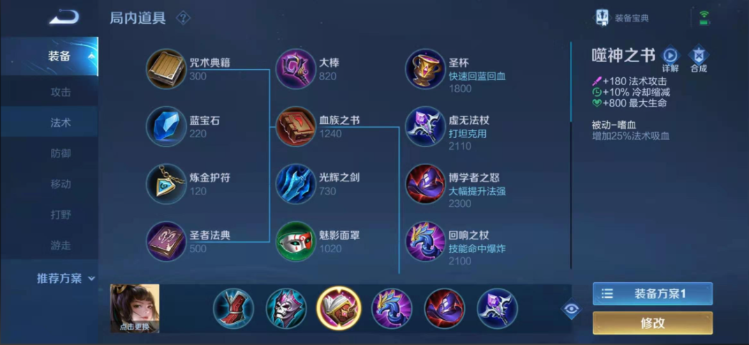 出装并非一成不变,如果你觉得自己的生存压力特别大,或者对方控制技能很多,也可以对装备进行灵活调整。在面对有强回复能力的英雄时,可以将回响之杖替换成梦魇之牙来抑制对手回血。也有人会选择在中期出一件炽热支配者,这件装备在生命值较低时能提供一个护盾并解除控制,对于不习惯主动使用辉月或者经常被控住秒掉的新手玩家来说非常友好,可以替换辉月的位置。到了大后期,辉月或炽热支配者的主动技能进入冷却时,可以将其卖掉换成贤者的庇护(复活甲)或者名刀·司命来争取更多的操作空间。