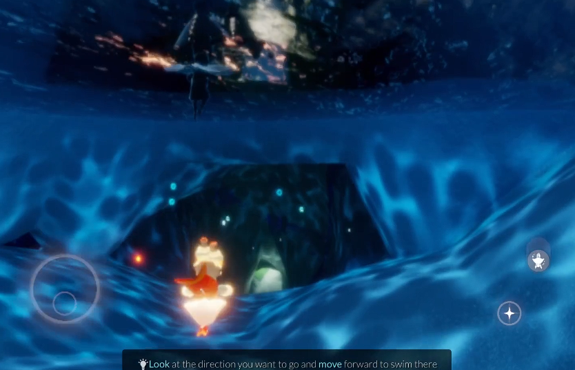 当你进入水中后,你会发现游戏界面右侧的方向键发生了变化。原来控制跳跃和飞行的按钮,现在变成了游泳键,点击就能向前游动,长按还能游得更快。这里会出现上浮和下潜两个新按键。想让角色往水下去就下滑摇杆或点击下潜键,想回到水面就上滑摇杆或点击上浮键。通过转动镜头,你就能控制下潜和游泳的方向了。