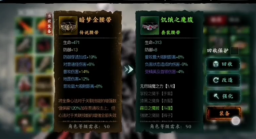 魔套指暗魔之力套装,这是一套围绕连招火焰机制设计的装备。它的核心思路是通过技能连招来叠加强力的火焰增益,两件套效果让你从三火开始叠加连招火焰,四件套能大幅提升火焰带来的加成数值,六件套则能延缓火焰熄灭的速度,让你更容易维持高额的伤害加成状态。这套装备非常适合依赖技能链进行持续输出的流派,因为它的强度与你能不能流畅地打出连招息息相关。想要获取这套装备,无尽副本是最主要的途径,一般来说层数越高,掉落部件的概率也越大,所以多挑战高层无尽是不错的选择。