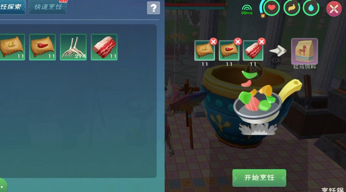 准备好小麦饲料包、辣椒饲料包和优质肉后,就可以开始正式制作火马饲料了。打开游戏中的烹饪锅选择烹饪功能,依次放入这三种准备好的材料,点击制造一个按钮就能成功合成一包火马饲料。如果材料充足建议批量制作,因为驯服火马通常需要多份饲料才能成功。