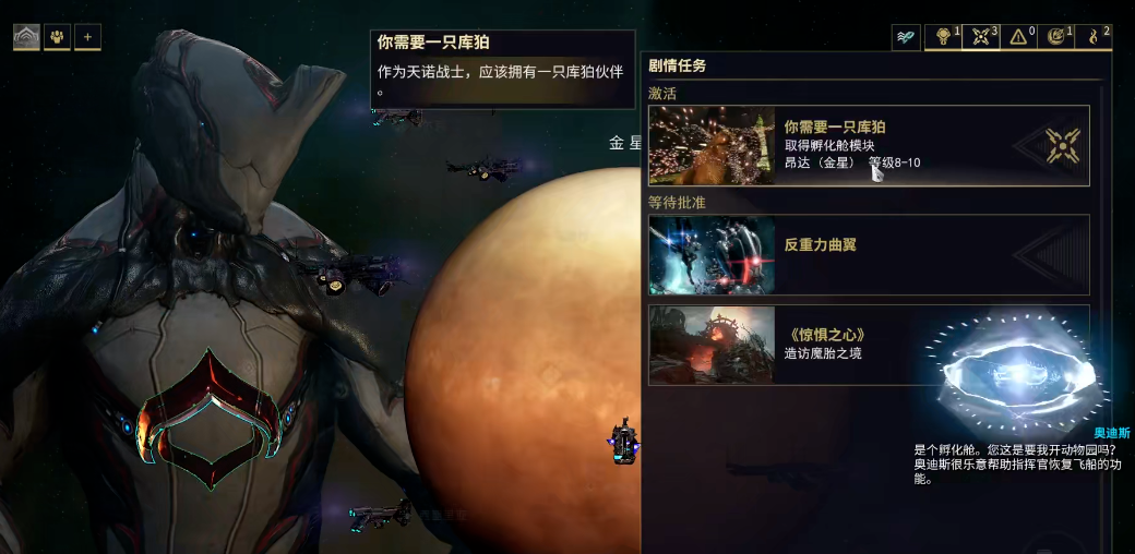 库狛是游戏里你可以培养的战斗伙伴,长得有点像狗,它不仅能陪着你冒险,还能在战斗里给你帮忙。整个旅程的开始,是你在飞船里的任务列表中找到并激活那个我需要一只库狛的任务。接取任务后系统会指引你去到指定的任务地点,你需要完成一个防御任务,核心目标就是保护一只野生的库狛,让它在这场战斗中存活下来。你可得好好照顾它,战术上最好优先清理那些威胁到库狛安全的敌人,也可以灵活利用战甲技能或者地图上的地形来保护它。成功坚守到所有敌人都被消灭并通过撤离点结算任务后,你就会得到一个非常关键的道具——忠诚库狛项圈,这个项圈是你完成任务达成的标志,也是开启下一阶段权限的钥匙。