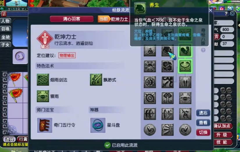 经脉流派选择清心羽客下的万寿真仙一脉,能最大化你的物理伤害能力。符石组合是力五庄伤害的重要来源,衣服和武器上务必打上天降大任(增加门派技能等级)和烟雨飘摇(提高烟雨剑法伤害)的组合,这就是所谓的双四孔,开了之后伤害提升明显,但代价就是血防会降低,所以才格外需要从装备和灵饰上弥补。坐骑属性自然全加力量,技能选择开天辟地增加忽略目标防御力的效果,对付高防怪很有效。宝宝搭配方面,自己带一只高速的血宠很有必要,关键时刻能给自己卡药或者解封。攻宠选择连击、偷袭、必杀技能齐全的,法宠带须弥真言的群法宝宝,清场效率高。