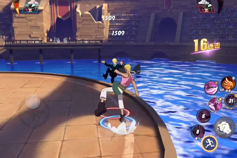 贝拉密的技能组设计非常有特色,核心围绕着其弹簧果实能力展开。他的一技能弹簧狙击是一个蓄力后发动的远距离突进技能,最大的亮点在于蓄力和突进过程中都附带霸体效果,这让他在先手进攻或躲避控制时非常从容,可以强行切入战场。 二技能弹簧暴拳则是一个带有抓取效果的强力控制技,同样在冲刺抓取阶段拥有霸体,一旦命中敌人就能将其按在地上拖行并最终抛向空中,为后续连招创造出完美的机会。 而他的奥义技能弹簧冲击释放时也带有霸体,会以快速的Z字形轨迹对前方大范围进行多段斩击,伤害可观。 这些技能赋予了他强大的突进、霸体和控制链能力,理论上是一名兼具先手和爆发的优秀战士。但硬币的另一面是,他的技能,尤其是一技能,有玩家反馈伤害数值并不突出,且所有非指向性的突进技能都对释放时机和预判有较高要求,一旦打空,较长的冷却时间可能会让你陷入被动。