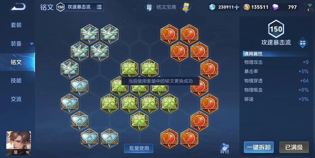 铭文搭配上暃的主流选择是物理穿透和攻击力为主的百穿铭文,具体为10个异变、10个鹰眼、10个隐匿。这套铭文提供了高达100点的物理穿透,还有物理攻击和移动速度加成,能确保暃在游戏前期就拥有强大的伤害能力,清野和抓人都会更有效率。隐匿铭文提供的移速也能让他支援跑图更快。有些玩家也会选择在红色铭文中加入个别红月来卡攻速阈值,让普攻手感更顺滑,但对于新手而言,标准的百穿铭文已经足够好用,理解起来也更简单直接。铭文就是英雄的前期基础,一套合适的铭文能让你的暃出门就比别人强势一些。