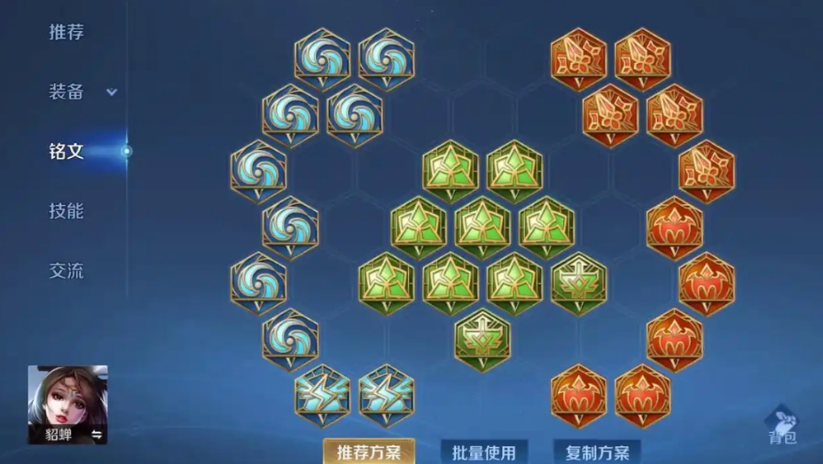 铭文搭配是达成无CD效果的重要组成部分,推荐使用10个怜悯铭文提供10%冷却缩减,10个梦魇铭文增强法术攻击和穿透,以及10个调和铭文提升生命值和回复能力。这套配置能弥补装备冷却属性的不足,并强化貂蝉的前期作战和续航,确保技能释放频率最大化,避免因冷却不足导致输出中断。