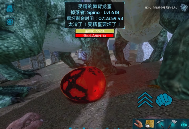 在龙蛋进入稳定的孵化状态后,持续的监护至关重要,许多细节疏漏可能导致前功尽弃。龙蛋的位置一旦确定便不可移动,如果捡起再放下,孵化进度将会重置。必须保证孵化区域的安全,漫长的孵化时间可能会吸引野生生物的攻击,建议在孵化室周围建立围栏或安排战斗恐龙进行守卫。在整个孵化期间,你需要密切关注龙蛋的红色生命值条,确保其在温度波动或意外事件中不会归零。要保证篝火或空调的燃料与电力供应充足,以避免温度失控。一个封闭的孵化室可以有效隔绝雨雪等恶劣天气的干扰,为孵化提供更稳定的环境。