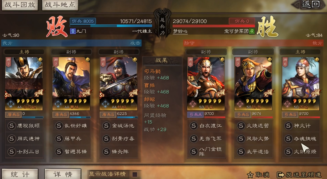 这套阵容的兵种选择盾兵,利用阵营加成与武将防御属性提升整体坦度,对战时优先规避当锋摧决、箕形阵等克制战法,遇到纯兵刃队伍可替换为藤甲兵进一步减伤,遇到多控制队伍可保留草船借箭保证行动连贯性。实战中张角依靠武峰阵的增伤效果,五雷轰顶可频繁触发群体伤害与震慑控制,配合士别三日的爆发伤害,能快速压低敌方血线,左慈与周劭的双重治疗和解控,可有效应对持续消耗与强控阵容,即便面对满红国家队也能打出高胜率,低红玩家使用也能稳定获取战功。