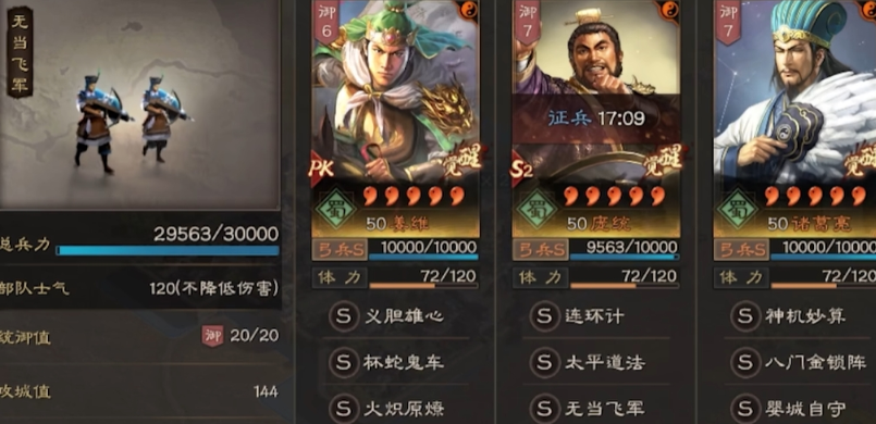 蜀国武将偏向爆发与坦度结合,姜维、庞统、诸葛亮组成的麒麟弓是法系天花板,姜维带夺魂挟魄与杯蛇鬼车持续压制,庞统携带太平道法与无当飞军放大谋略伤害,诸葛亮用八门金锁与刮骨疗毒控场续航,三人全智力加点最大化输出;关银屏、张飞、刘备组成的蜀枪侧重物理突击,关银屏带横扫千军与盛气凌敌打控制,张飞补充AOE伤害,刘备提供稳定治疗,适合开荒与中期过渡,转型灵活且战力扎实。