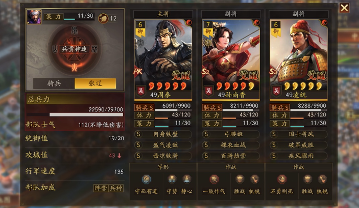 吴国武将以速攻与灼烧体系为主,太史慈、陆逊、程普的虎臣弓适配多数战场环境,太史慈带当锋摧决与折冲御侮先手压制,陆逊搭配风助火势与火炽原燎触发连锁灼烧,程普带草船借箭与抚辑军民承伤解控,速度调配保证先手优势;孙权、周泰、凌统的吴骑依靠连击与先攻机制快速破局,周泰为核心承伤位,凌统提供增益,孙权随机强化队友,面对脆皮队伍可快速终结战斗。