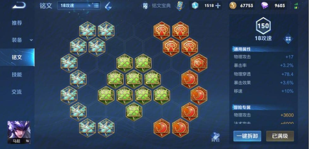铭文选择10祸源、10鹰眼、10狩猎,祸源提供16%暴击率,让铠前期就能频繁触发暴击,快速建立伤害优势。鹰眼的64点物理穿透,配合暗影战斧的穿透效果,双重穿透让铠攻击敌方英雄时几乎无视护甲,打坦克也不会刮痧。10狩猎带来10%攻速与10%移速,攻速提升清线与普攻连贯性,移速则让铠支援、追击更灵活,能快速贴近敌方脆皮打出爆发。这套铭文与出装属性高度契合,从前期到后期全程保障高伤输出,没有明显伤害真空期。