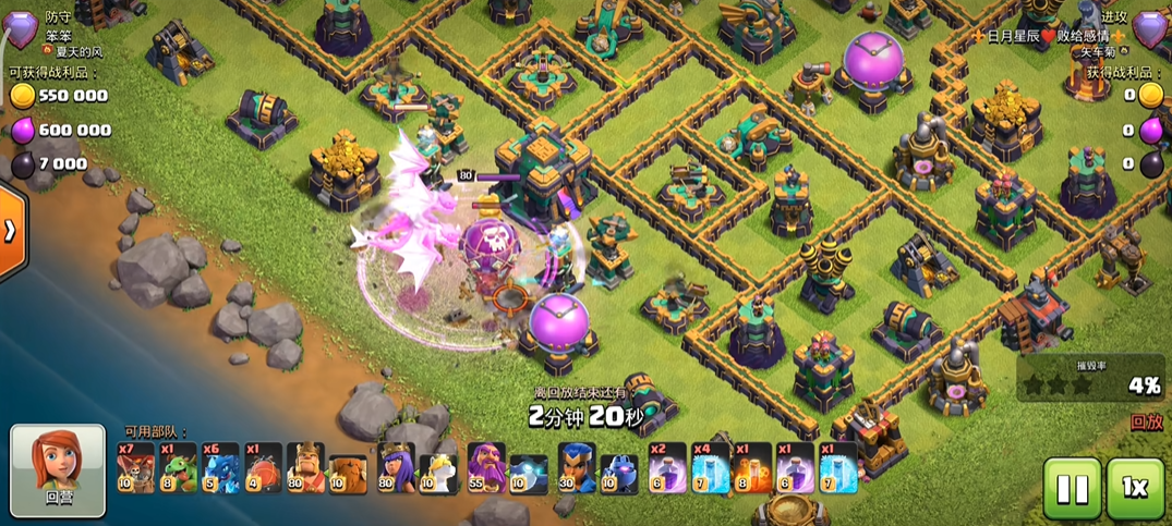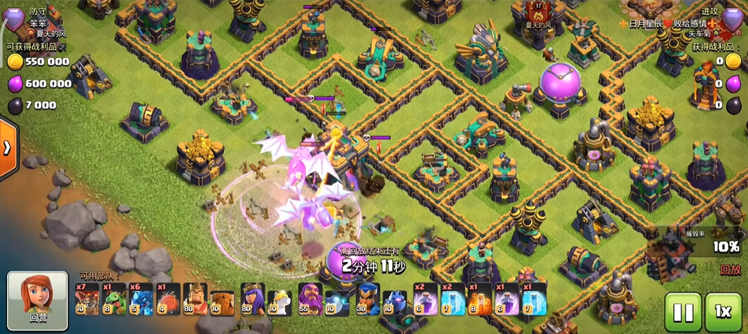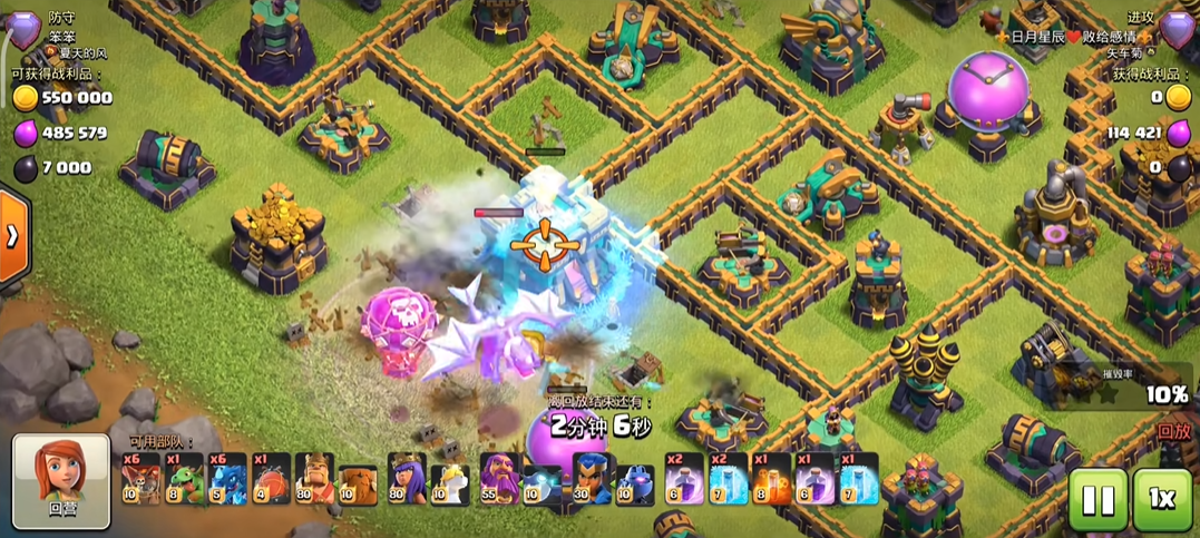 实战中要灵活调整战术,面对防空分散的阵型,多路线清边后分批次投放龙群,逐步蚕食防御;遇核心紧凑阵型,集中一点突破,用狂暴加冰冻强行撕开防线,推进时持续关注龙群血量与防御状态,及时补法术或调整投放位置,确保龙群始终保持火力集中,避免因分散被逐个击破,同时用剩余亡灵、气球清理角落建筑,保证摧毁率达标,稳定获取三星。