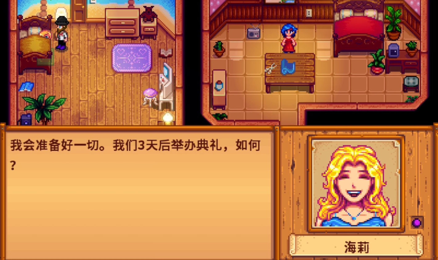 买完美人鱼吊坠,直接送给海莉就能订婚。三天后婚礼会自动举行,记得提前把农舍升级到至少二级,不然可没法迎接新娘。结婚后海莉会搬进农场,偶尔帮忙浇水、喂动物,甚至做早餐。不过每周她会有一天回自己家,不用太担心,这是正常设定。