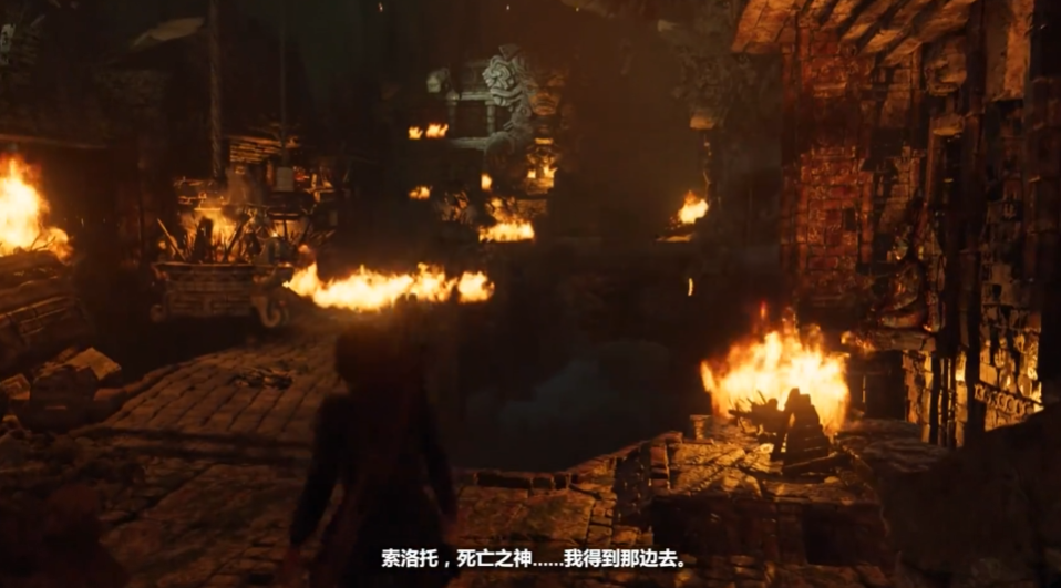 拉动第二个转杆会打开风口并吹灭中间通道的火焰,这时要把握时机用绳索箭矢瞄准石摆锤上方的绳索桩。当石摆锤被风吹到右侧最高点时射出绳索,就能拉动它撞开堵塞通道的杂物。完成后记得关闭第二个风口,从清理干净的通道跳到左侧平台。
