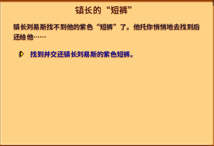 另一个经典任务是镇长的短裤,该任务会在夏季的第三天通过信箱来信自动触发,镇长会告知你他丢失了紫色短裤,短裤实际藏在牧场主玛妮的卧室里,要进入她的卧室,你必须先通过每天打招呼和赠送她喜爱的礼物来提升好感度,当好感度达到两颗心后,便可在上午进入她的房间,在床边找到紫色短裤,将短裤交还给镇长即可完成任务并获得金币奖励,这条短裤本身也是一个有趣的道具,可以在秋季展览会上展示或在夏威夷宴会上放入汤中,引发特别的彩蛋剧情。